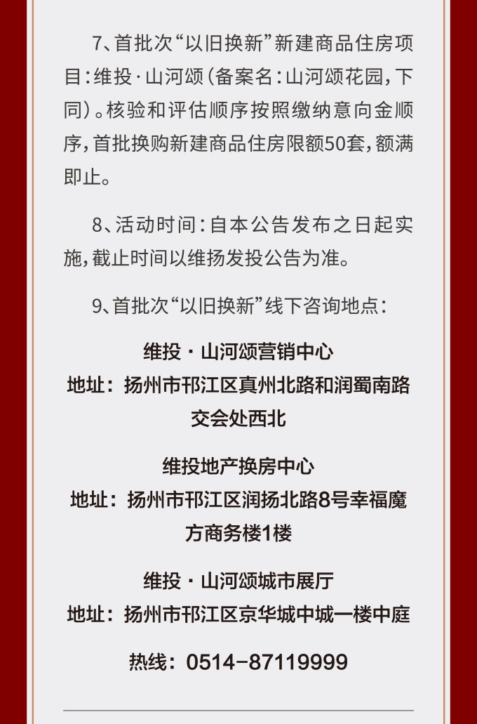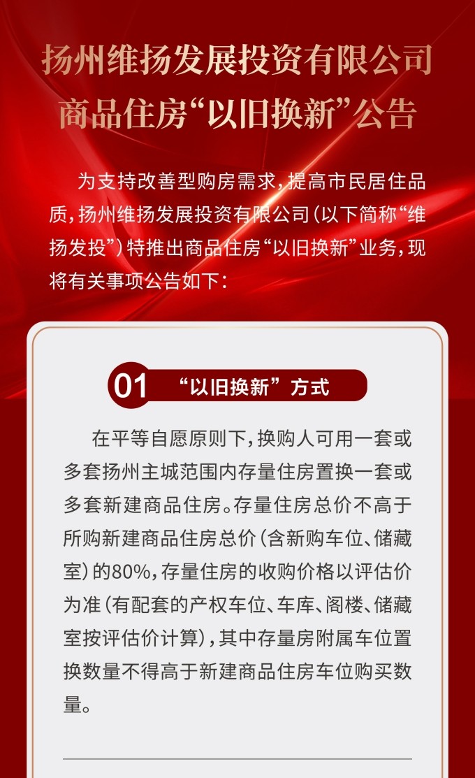 住房“以舊換新”“以房換房”是各地房地產(chǎn)新政中以“小細(xì)節(jié)”撬動“大市場”的重要舉措。維揚(yáng)發(fā)投積極響應(yīng)政府新推行的“以舊換新”政策,踐行“惠民”理念,整合各項(xiàng)資源,搭建換房中心平臺,為買房人提供一站式以舊換新置換服務(wù),推動激活邗江區(qū)商品房市場活力。 此次維揚(yáng)發(fā)投“以舊換新”工作以其自主開發(fā)的維投·山河頌項(xiàng)目為試點(diǎn),由國企背書、置換范圍廣、全流程專業(yè)服務(wù)。首批換購新建商品住房限額50套,換購人可通過登錄“維揚(yáng)發(fā)投商品住房‘以舊換新’線上報(bào)名系統(tǒng)”報(bào)名,具體要求詳見公告。